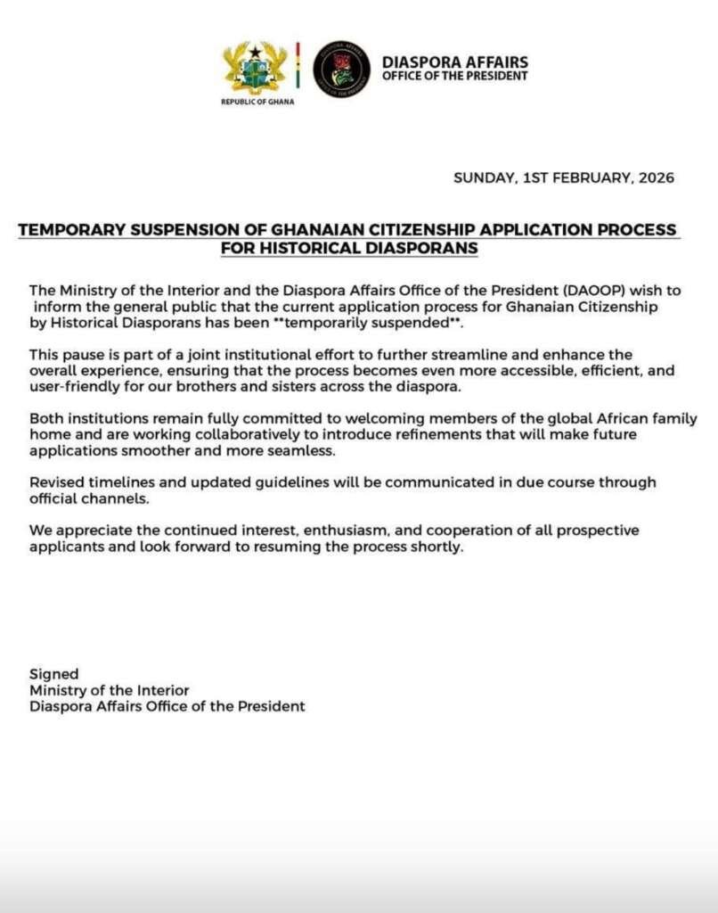 On Sunday night, February 1, 2026, the Diaspora Affairs Office of the President and the Ministry of the Interior announced a temporary suspension of the citizenship application process for historic diasporans, stating the pause is intended to “streamline and enhance” the framework and that updated guidelines and timelines will be communicated through official channels.