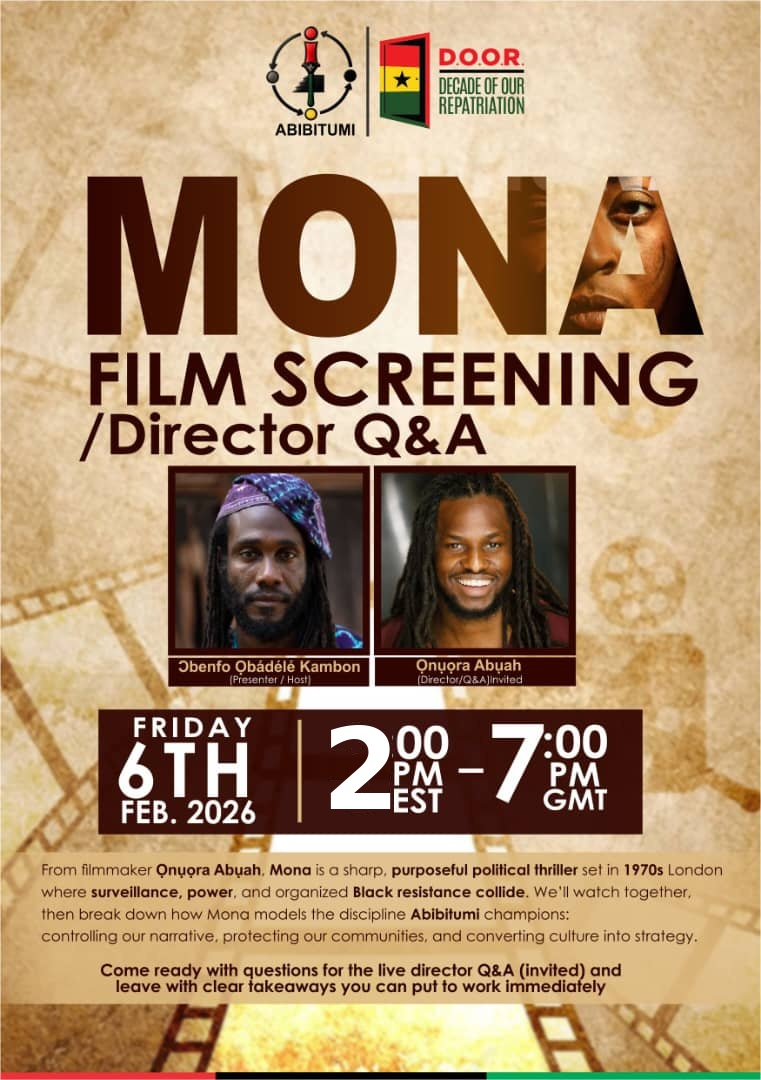 From filmmaker Ọnụọra Abụah, Mona is a sharp, purposeful political thriller set in 1970s London—where surveillance, power, and organized Black resistance collide. We’ll watch together, then break down how Mona models the discipline Abibitumi champions: controlling our narrative, protecting our communities, and converting culture into strategy. Come ready with questions for the live director Q&A (invited) and leave with clear takeaways you can put to work immediately.