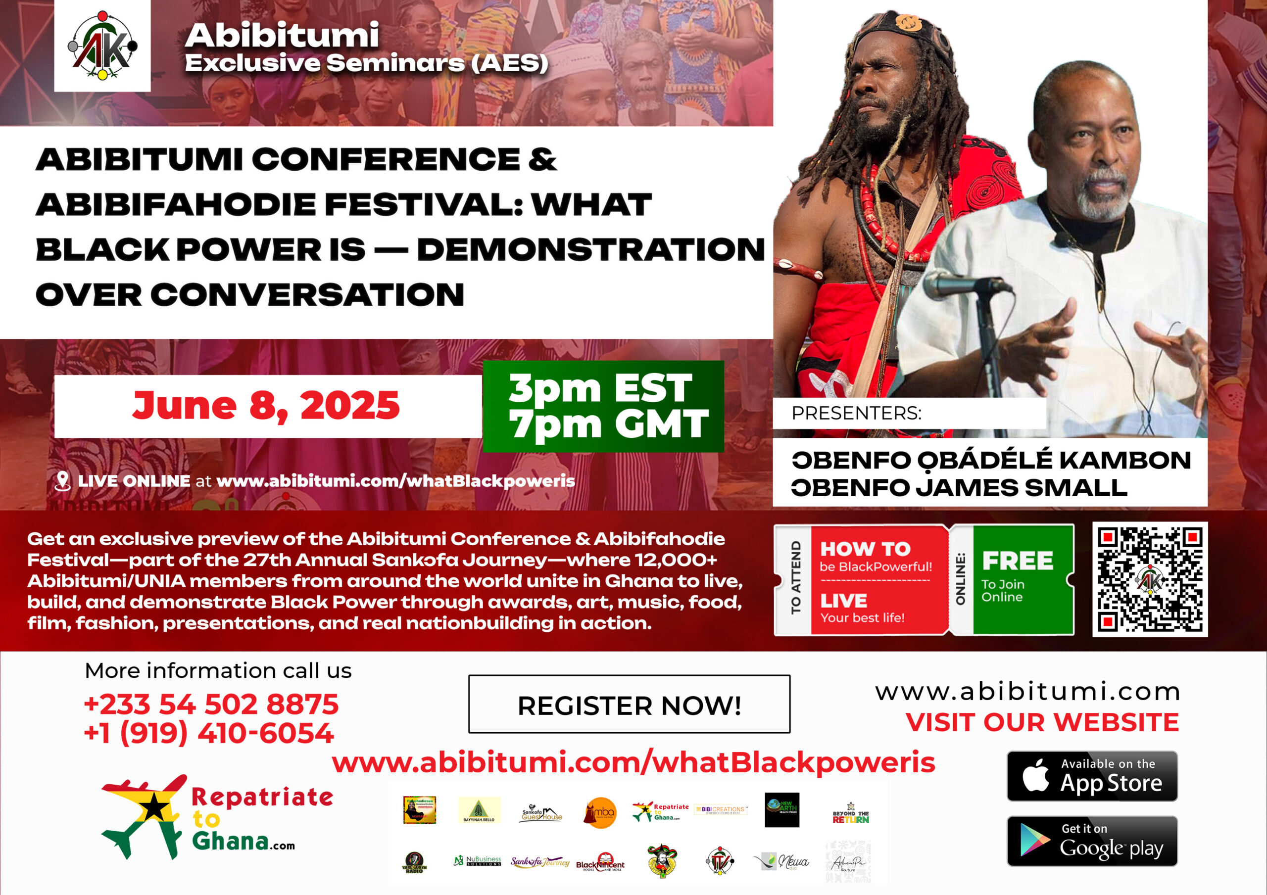 Join Ɔbenfo James Small and Ɔbenfo Ọbádélé Kambon as they discuss 12,000+ global Abibitumi members converging in Ghana for the Abibitumi Conference & Abibifahodie Festival—part of the 27th Annual Sankɔfa Journey—celebrating real Black Power through awards, art, music, film, fashion, food, and nationbuilding in action.