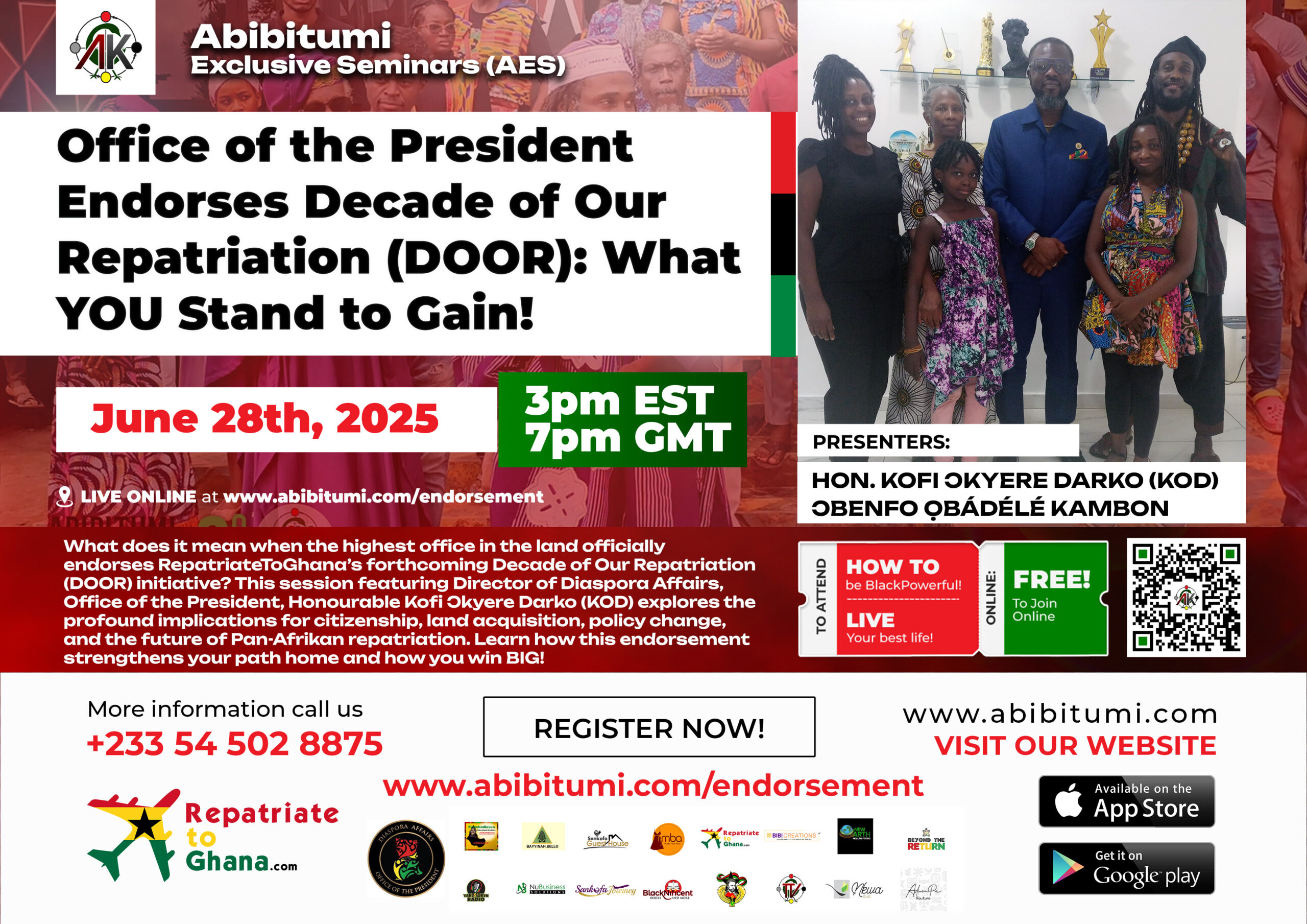 A historic Abibitumi Exclusive Seminar featuring Ɔbenfo Ọbádélé Kambon unpacking the official endorsement of RepatriateToGhana.com by the Office of the President of Ghana. Learn how this changes everything—from land and citizenship to policy and Pan-Afrikan repatriation. Register now for live online access!