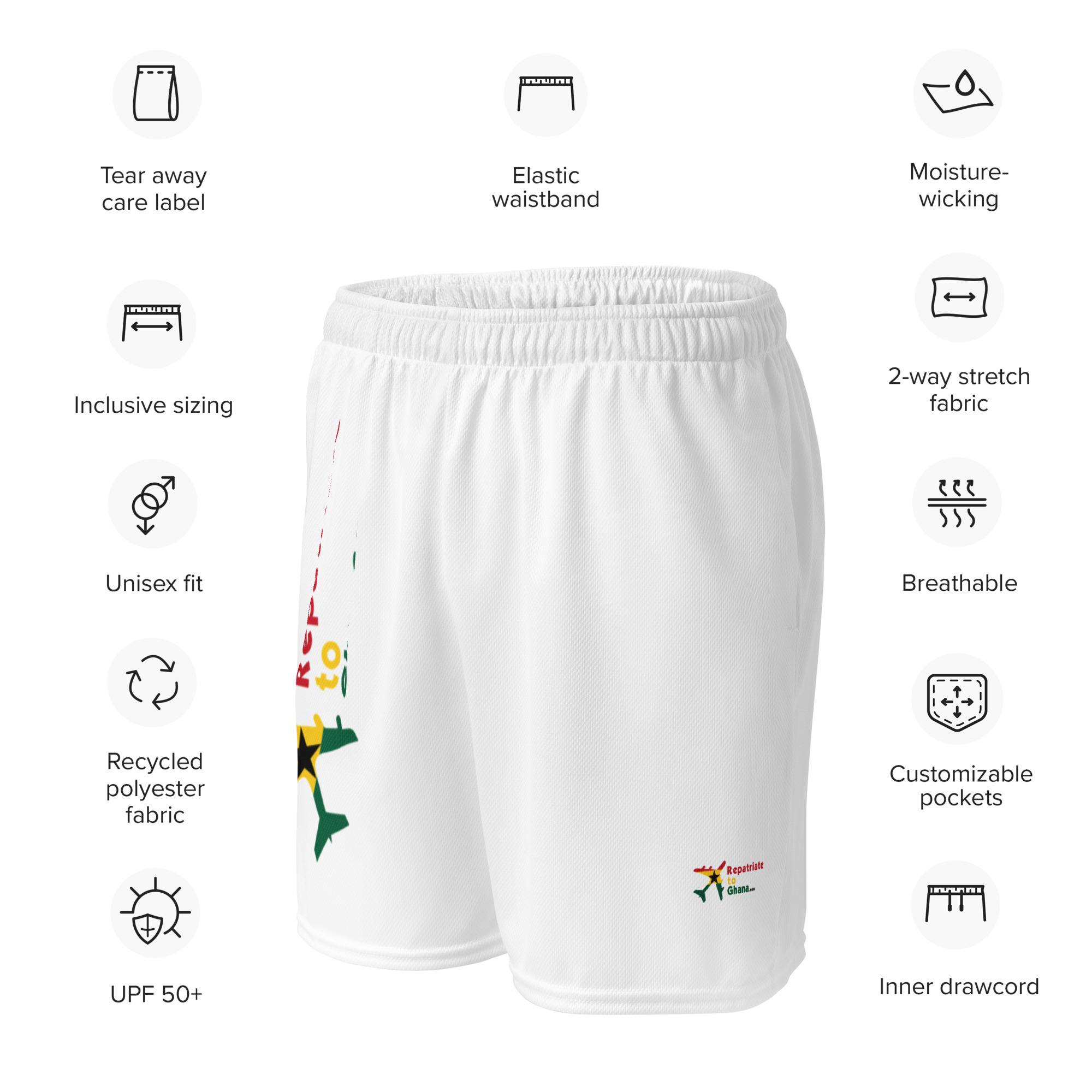 These RepatriateToGhana.com (R2GH.com) shorts are the perfect choice for those who need flexibility in their attire. Whether you’re hitting the gym, running errands or enjoying an outdoor activity, they’ll be your trusty companion. Look good, feel good, and stay comfortable, all with the unisex mesh shorts.