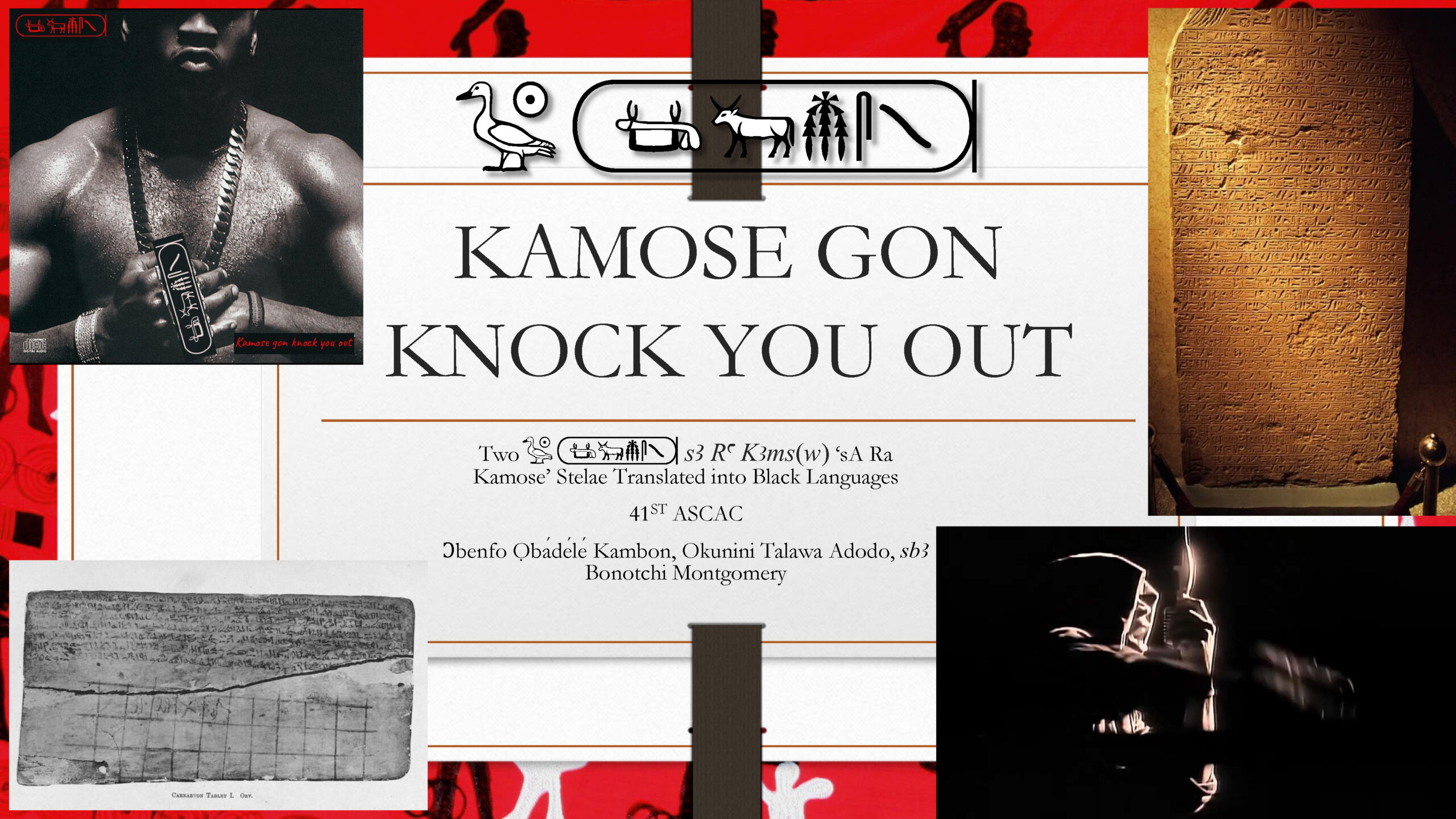 In “Kamose Gon Knock You Out”, the presenters decode the twin stelae of sA Ra Kamose—military, political, and ideological declarations of war from classical Kmt ‘The Black Nation/Land of Black People’—and translate them into multiple Black languages: Ebonics, Asante Twi, Yorùbá, and Jamaican Patwa.